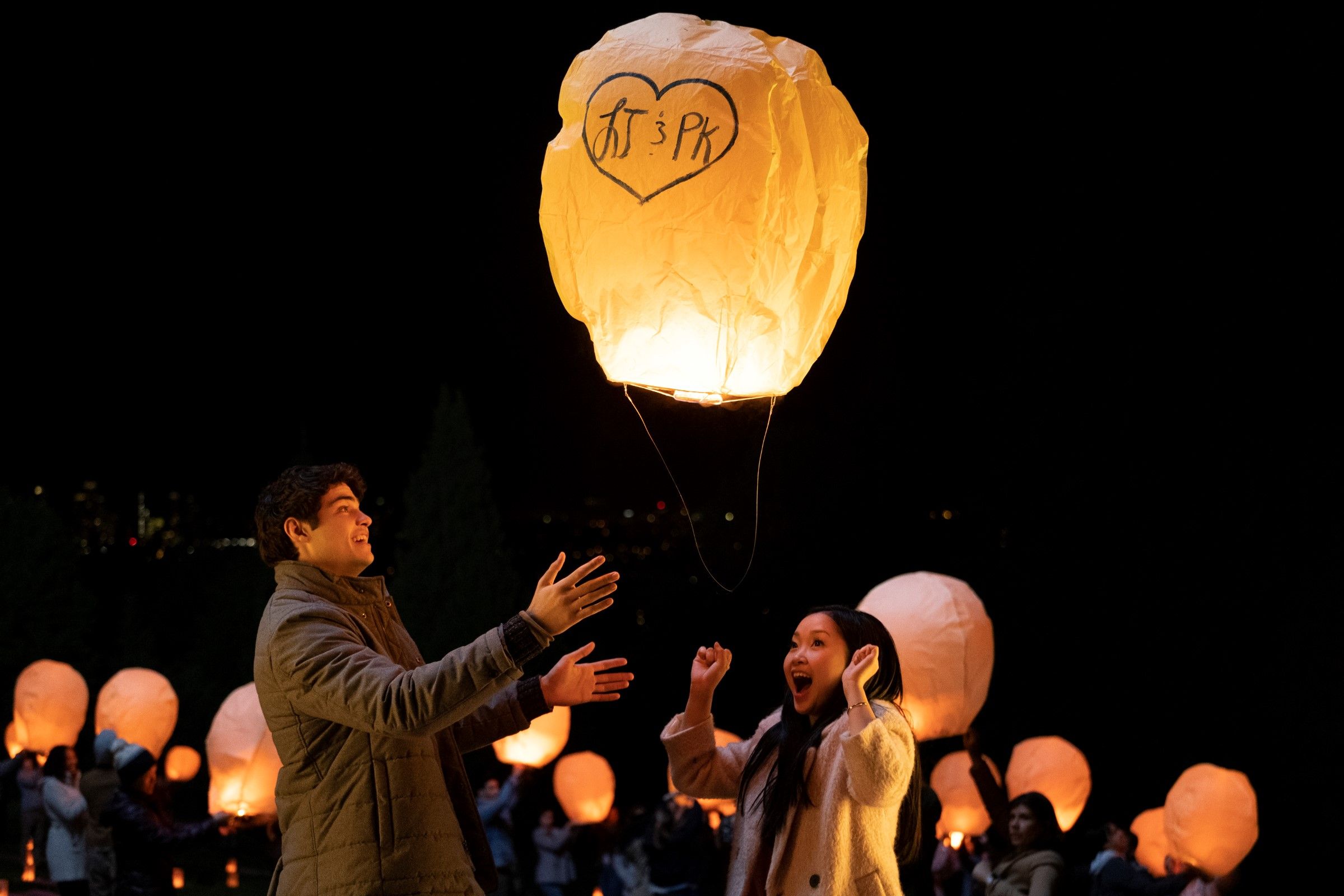 Das verdeutlichen auch die ersten Bilder zu „To All The Boys: P.S I Still Love You“. Auf den Bildern sehen wir zum einen, wie sich Lara Jean und Peter tief in die Augen schauen oder gemeinsam einen Kerzenballon steigen lassen. Doch wir sehen eben auch, wie sich Lara Jean und John Ambrose in schicken (Prom?)Kleidern und romantisch-verschneiter Atmosphäre in den Armen liegen.