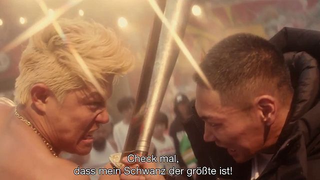 Mit einer fünfminütigen Plansequenz führt Sion Sono in einen Hip-Hop-Kosmos ein, der so grell, skurril und überdreht ist wie die Mega-City Tokio selbst: Eine hippe Oma an den Turntables, weibliche Gangsta-Rapper und ein blondierter Muskelmann, der mit dem Messer auf der entblößten Brust einer Polizistin über die Lage in der Stadt aufklärt, geben einen ersten Vorgeschmack auf den überbordenden und ungehemmten Wahnsinn der folgenden zwei Kinostunden. „Tokyo Tribe“ ist eine Rap-Oper im XXL-Format, fast alle „Dialoge“ werden als Sprechgesang vorgetragen. Dafür wurden bekannte japanische Hip-Hopper engagiert und zusätzliche Rap-Castings auf YouTube durchgeführt. Angeführt wird das ungewöhnliche Ensemble indes von dem auf Yakuza-Rollen spezialisierten Ex-Sumo-Ringer Riki Takeuchi („Dead or Alive“-Trilogie, „Battle Royale 2“). Dessen Figur Buppa ist eine unwahrscheinliche Mischung aus Nippon-Elvis, sadistischem Gangster und fettem Sumo-Buddha.