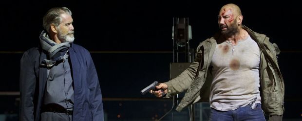 Der hünenhafte Wrestling-Champion Dave Bautista bestätigt hier, dass er vor allem ein Mann fürs Grobe ist. Zugleich beweist er nach seiner wohl bekanntesten Rolle als Dumpfbacke Drax in „Guardians Of The Galaxy“ aber auch hier in einigen der ruhigeren Dialogszenen, in denen er mit seinen Schuldgefühlen wegen des Kriegseinsatzes ringt, sein durchaus vorhandenes Schauspieltalent. Ex-007 Pierce Brosnan („Mamma Mia! 2“) kommt ein ungleich kleinerer Part zu. Erst im letzten Drittel taucht er für ein nur wenige Minuten langes Gastspiel auf und übt sich auch dort in Zurückhaltung: Abseits eines diabolischen Gleichnisses zum Opfern eines Einzelnen zum Wohle Vieler sind ihm nur wenige Dialogzeilen vergönnt.
