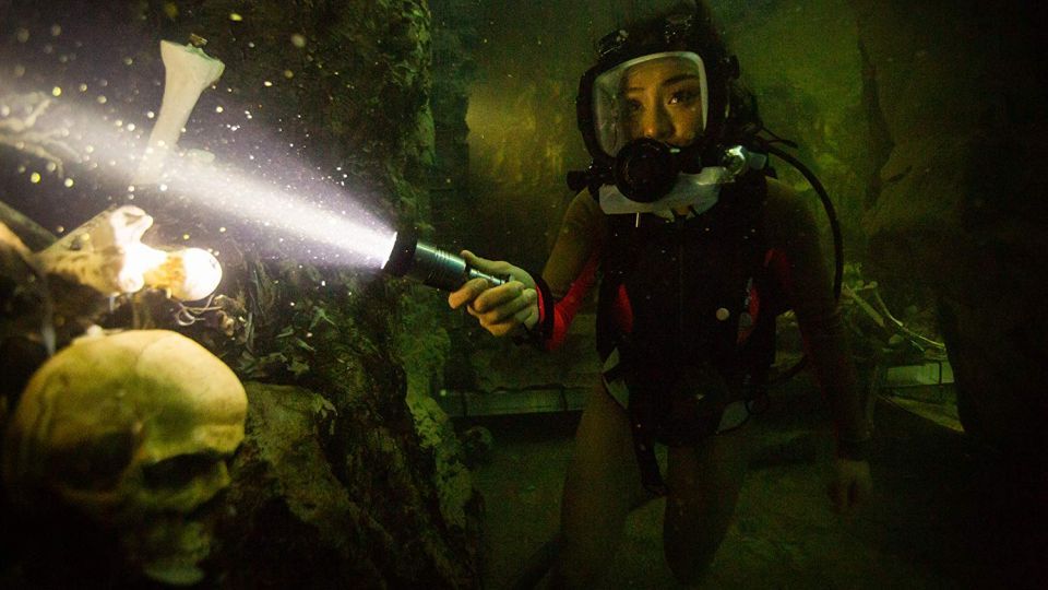 Was die optischen Reize angeht, hat „47 Meters Down: Uncaged“ klare Vorteile gegenüber seinem Vorgänger. Anstatt über weite Strecken lediglich einen rostigen Käfig vor nahezu leerem Meeresboden zu zeigen, wird hier nun deutlich mehr visuelle Abwechslung geboten (weshalb das Budget diesmal auch etwas höher liegen dürfte als beim nur fünf Millionen Dollar teuren ersten Teil). Das Labyrinth der Gänge und Katakomben der alten Maya-Grabstätte, inklusive einer komplett überfluteten Halle mit Altar und lebensgroßen Skulpturen, bietet interessantere, vielseitigere Möglichkeiten, die Figuren und damit den Zuschauer zu überraschen. Für mehr Vielfalt sorgt zudem der Umstand, dass dieses Mal doppelt so viele Mädchen fatale Entscheidungen treffen können, um sich (erneut) in Lebensgefahr zu begeben. Auch wenn sich Roberts und sein Co-Autor Ernest Riera dabei ausschließlich mit recht konventionellen Archetypen (burschikoses Alpha-Girl, kapriziöse Prinzessin, ängstliches Mäuschen) zufriedengeben.