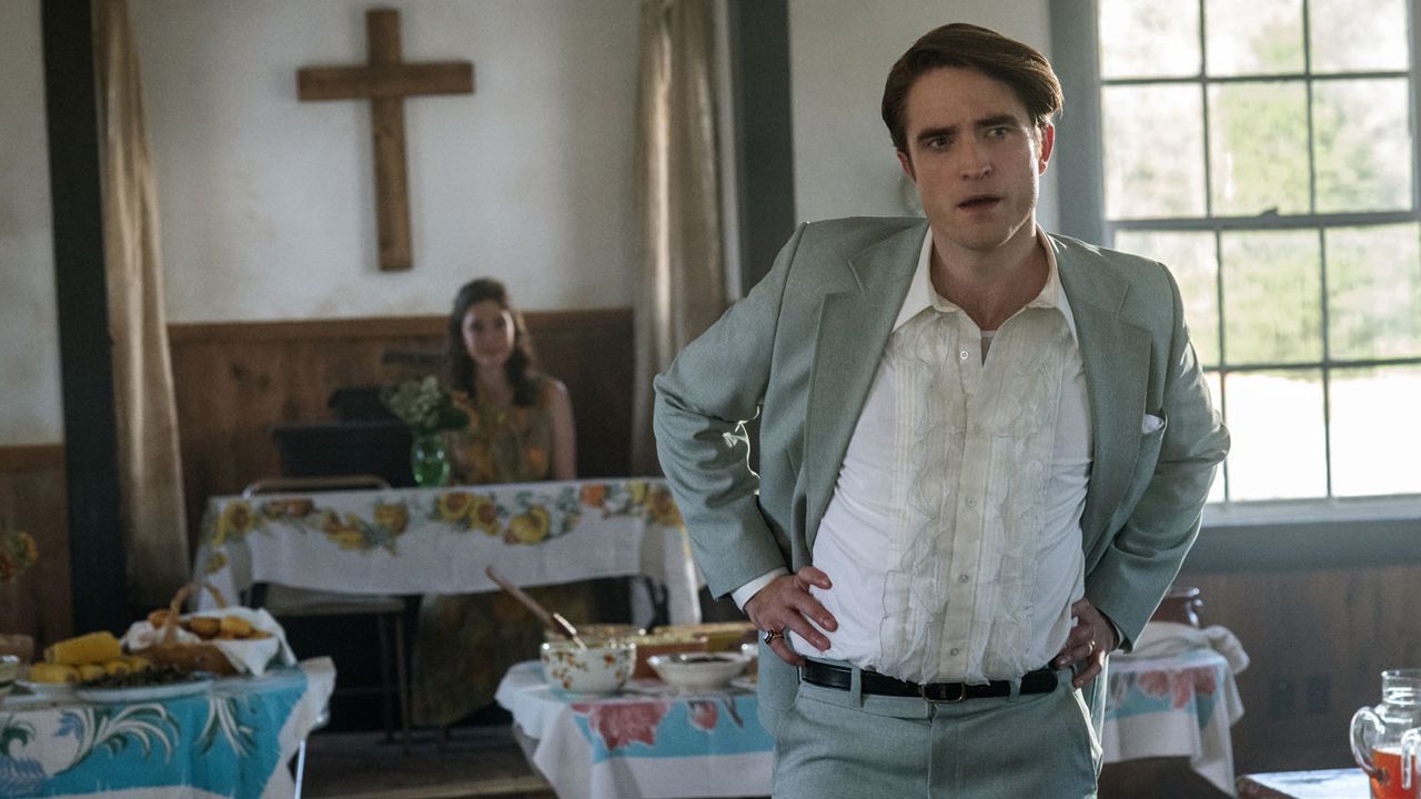 Eng verbunden ist ihre Geschichte mit der von Robert Pattinsons redegewandtem Prediger. Wer nach der Darstellung eines wahnsinnigen Bibel-Rezitierers in der ersten Stunde durch Harry Melling („The Old Guard“) denkt, das geht nicht mehr wilder, wird in der zweiten Filmhälfte vom Gegenteil überzeugt. Schon Melling ist völlig drüber, wenn er mit weit aufgerissenen Augen einen Mann spielt, der glaubt, dass ihm Gott die Kraft der Wiederbelebung gegeben hat. Doch Pattinson setzt mit einer Aussprache, bei der Konsonanten so langgezogen werden, als stünden die Buchstaben mindestens zehn Mal im Wort, noch einen drauf. Es scheint so, als hätte bei Netflix der künftige „The Batman“-Star das Recht, komplett frei zu drehen – was dann großartig, aber nur in reduzierten Dosen ertragbar ist. Das hat sich schon in „The King“ (da noch mit französischem Akzent) angedeutet und wird jetzt in etwas größeren Rolle auf die Spitze getrieben.