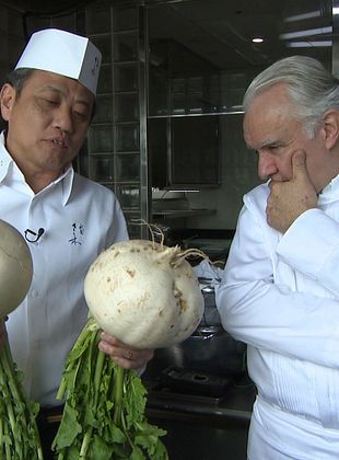 Der französische Meisterkoch Alain Ducasse nimmt die Herausforderung an, mit japanischen Zutaten Köstlichkeiten seiner Heimat zuzubereiten.