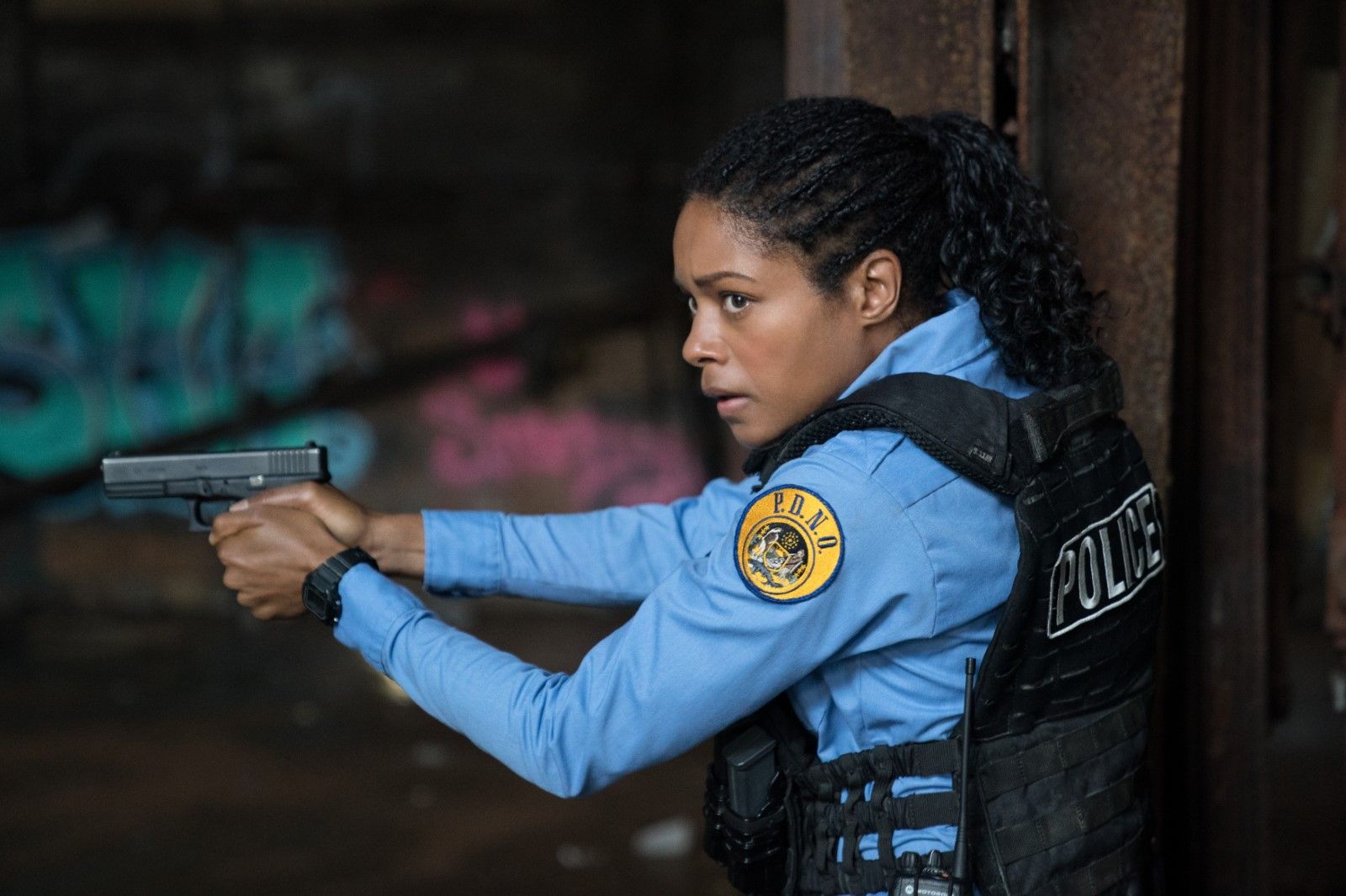 Während einer ähnlich desillusionierenden Sequenz klopft die angeschossene Alicia auf der Flucht vor den korrupten Kollegen an mehrere Türen des Viertels, in dem sie einst selbst aufgewachsen ist. Sie bettelt geradezu um Unterschlupf, aber niemand lässt sie herein. Wer überhaupt antwortet, weist sie schroff ab – teilweise aus Angst, in etwas hineingezogen zu werden, hauptsächlich aber, weil sie eine Polizeiuniform trägt. Harris spielt die im Häuserkampf erfahrene Ex-Soldatin in diesen Szenen nicht nur glaubhaft kompetent, sondern auch erschrocken und ernüchtert ob der ständigen Abweisungen – das Ergebnis sind die mit Abstand intensivsten zehn Minuten des Films, die so ähnlich auch im Irak spielen könnten. Sobald Alicia die blaue Uniform trägt, ist sie ein Feind in ihrer eigenen Heimat – fast so wie einst im Krieg.