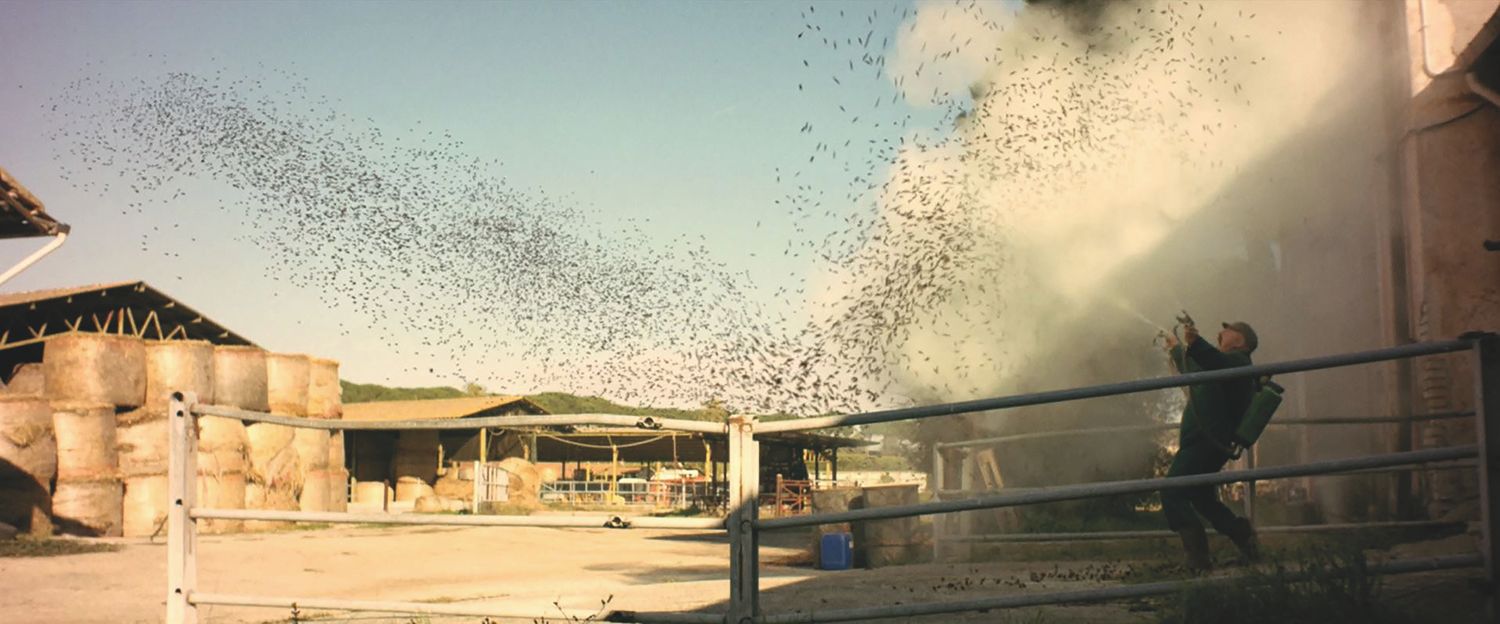 Auch drei verstrahlte Klischee-Kiffer (leitmotivisch mit ein paar Reggae-Einlagen untermalt), die sich im Wald verirrt haben, verschwinden nach einer Handvoll unnötiger Szenen, weil ihnen das Weed ausgegangen ist. Nur ein faschistisch-martialischer Landwirt, der auf seinem Hof den mutierten Pferdebremsen mit allerlei Insektiziden einheizt, bevor er bis auf die Knochen von ihnen abgenagt wird (und sich selbst die malträtierten Gliedmaßen abhackt), sorgt für ein paar ungläubige Lacher.