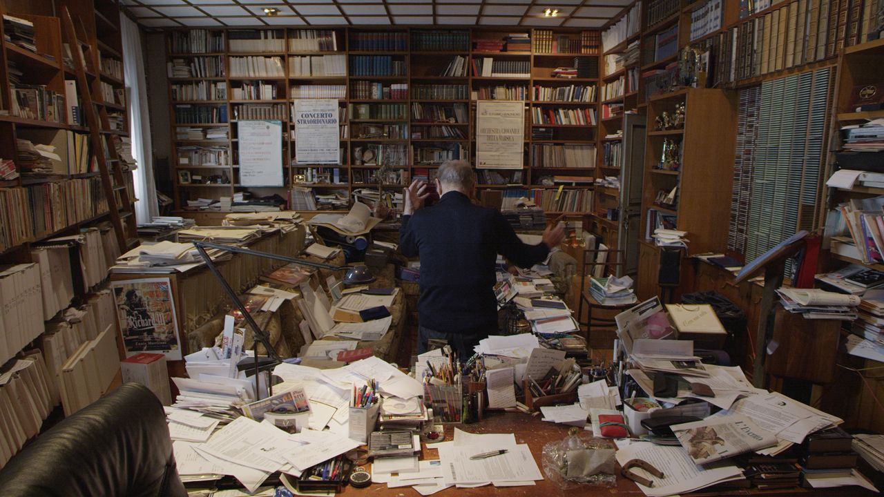 Aber es ist nicht immer nur der Bombast der Konzerttouren. Morricone trägt im Interview auch immer wieder einige seiner Stücke selbst vor. Da formt er mit dem Mund Oboenklänge oder jault in einer lustigen Sequenz den „Coyote Call“ nach. Hier bekommen wir auch einen großartigen Einblick in den speziellen Arbeitsprozess des Musikers. Während seine Wohnung ansonsten elegant eingerichtet ist, gibt es im Arbeitszimmer keine Stelle, an der nicht Papier liegt.