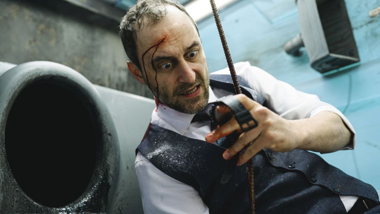 „Ach du Scheiße!“ funktioniert dann eben auch deshalb über weite Strecken ziemlich gut, weil Rinker die vermeintliche Ausweglosigkeit von Franks Klaustrophobie auslösender Situation für voll nimmt. Das Karikaturistische ist zwar auch immer da, bleibt aber buchstäblich zunächst einmal draußen und tönt von dort in Form der launigen Biertischreden von Horst immer wieder per Lautsprecher übers Szenario hinweg, bis es dann kurz vor Schluss doch noch zur direkten Konfrontation der beiden Handlungssphären – von innerhalb und außerhalb des Dixi-Klos – kommt. Und so lächerlich Franks Lage objektiv auch wirken mag, die Inszenierung bleibt nah genug bei ihm und seinem Todeskampf, um diesen selbst keineswegs ins Lachhafte zu verzerren. Stattdessen bleibt der Schmerz seines verstümmelten Arms so real wie seine Angst und Verzweiflung spürbar – jedenfalls so lange, bis Rinker dann zum großen Showdown hin doch alle Gäule durchgehen und das bis dahin minimalistische Kammerspiel doch noch zum Funsplatter-Holzhammer greift.