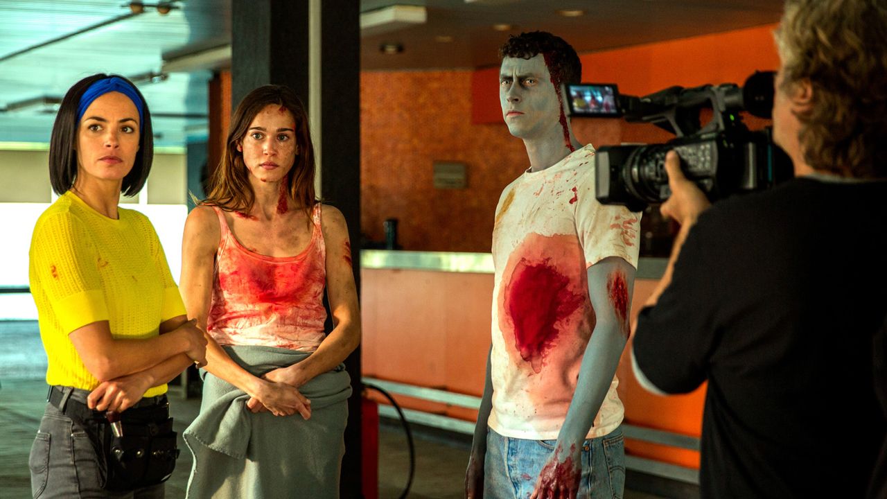 Rémi muss sich nämlich nicht nur mit Durchfall-Erkrankungen in der Crew, seinem besserwisserischen Hauptdarsteller Raphaël (Finnegan Oldfield) und geschrotteter Technik herumschlagen, kurz vor Sendestart haben auch noch zwei seiner Stars einen Unfall – und so müssen er und seine Ehefrau Nadia (stark: Bérénice Bejo) kurzerhand selbst als Darsteller*innen einspringen. Nadia verliert sich dabei aber so sehr in der Rolle der Zombie-Killerin, dass sie bald das halbe Team mit zielsicher platzierten High Kicks lahmlegt.