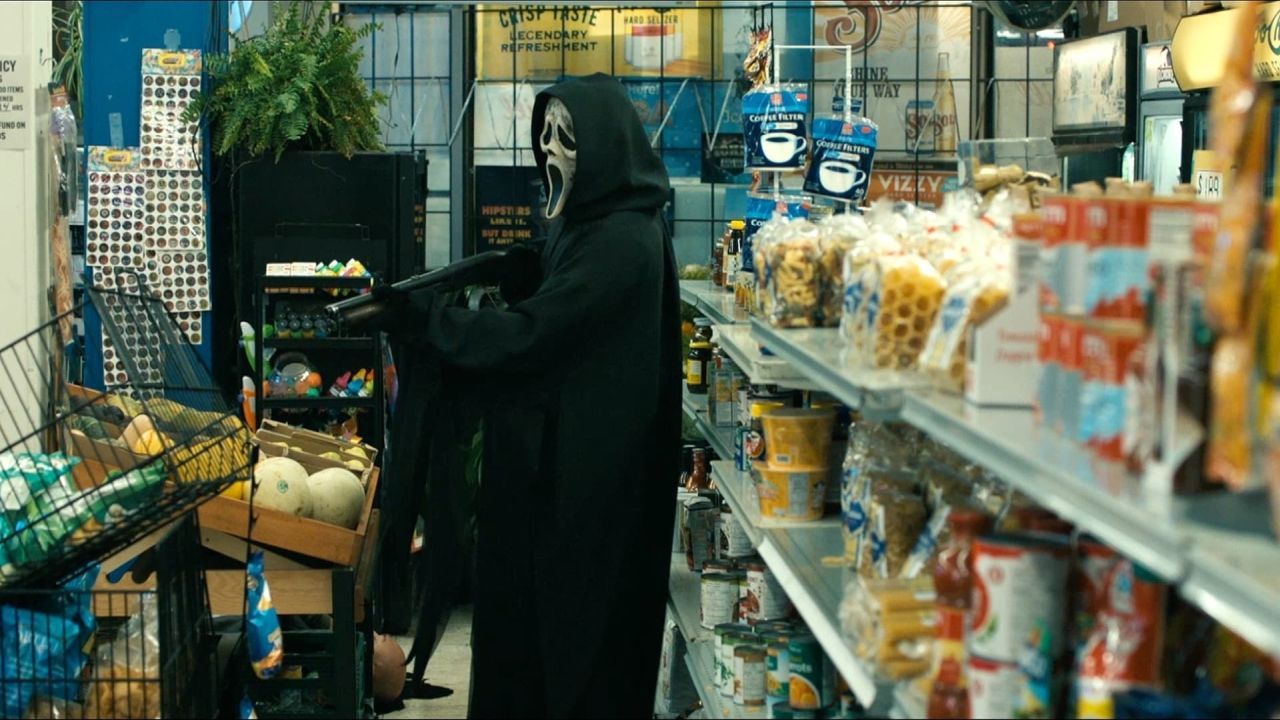 … und dieses bringt es unter anderem mit sich, dass Ghostface eine ganz neue Durchschlagskraft an den Tag legt: In der bereits im Trailer angerissenen Szene im Supermarkt schnetzelt er sich eben notfalls auch schon mal durch die versammelte Kundschaft plus den mit einer Schrotflinte bewaffneten Besitzer, um zu seinem eigentlichen Ziel zu gelangen – mit dem Sprung von Woodsboro nach New York hat offensichtlich auch der Killer zugelegt, wenn er hier in einigen Szenen fast schon an einen Michael Myers oder Jason Voorhees statt an den mitunter auch schon mal ganz schön verplanten Ghostface aus früheren Teilen erinnert.