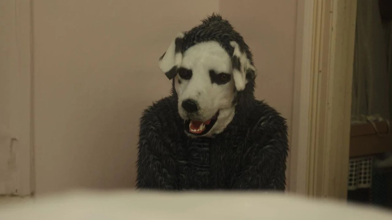 Christian stellt Frank vor, als ob es ganz normal wäre, dass er sich einen Mann im Hundekostüm als Haustier hält.