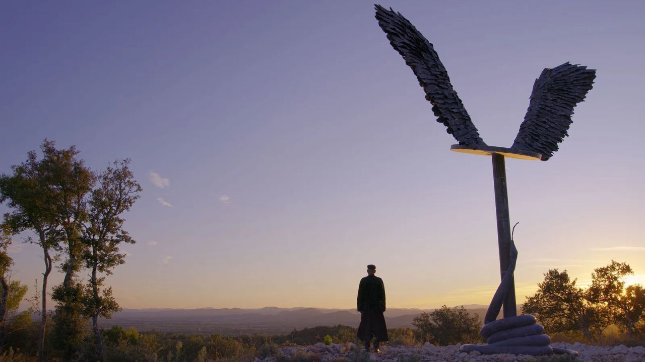 Auf den Hügeln, inmitten eines kleinen Wäldchens, vor den Hintergrund einer wildromantischen Landschaft, stehen da etwa weiße Kleider im Raum, mit Gips gehärtet, anstelle von Köpfen sieht man Steine oder Glassplitter. Schwerelos umfährt die Kamera die Skulpturen, die ultrascharfen 6K-Bilder lassen sie und die sie umgebende Natur so lebendig wirken, als wäre man persönlich vor Ort. Ein Schnitt und wir befindet uns in einem Vorort von Paris, wo Kiefer inzwischen sein Atelier hat, wobei sich „Atelier“ hier etwas zu bescheiden anhört. Eine gigantische Halle voller Kunstwerke ist zu sehen, so groß, dass Kiefer darin mit dem Fahrrad unterwegs ist. Eine Leinwand, an der er im Film arbeitet, ist gut 10 x 20 Meter groß, so dass Kiefer nicht nur eine Hebebühne, sondern auch kesselgroße Farbeimer verwenden muss. Dieser schiere Bombast von Kiefers Werken ist auch eine Ursache der Kritik: In Deutschland mag man es eben lieber bescheidender und nicht mit solch ausgestelltem Drang zur Größe wie bei Kiefer.