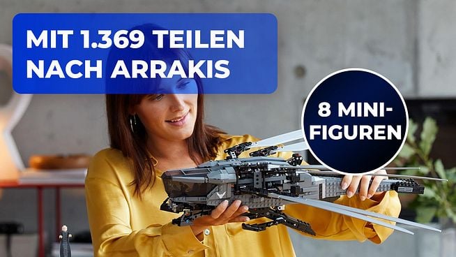 Das eindrucksvolle LEGO-Set, das nicht nur „Dune“-Fans begeistert, besteht aus insgesamt 1.369 Teilen. Habt ihr diese nach stundenlangem Bauspaß einmal komplett zusammengesetzt, misst das Modell des Atreides Royal Ornithopter 56 cm in der Länge und bringt es bei ausgeklappten Flügeln auf eine eindrucksvolle Spannweite von 80 cm. Sollte in eurer Vitrine nicht ausreichend Platz zur Verfügung stehen, könnt ihr die Flügel natürlich auch einklappen.