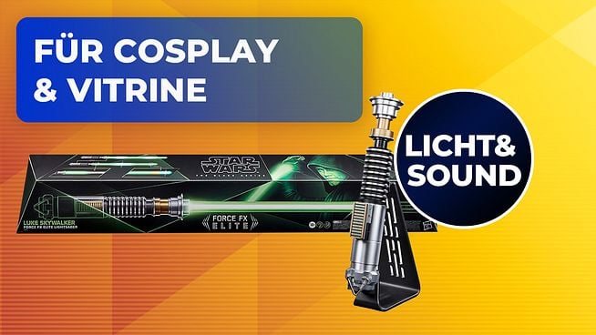 Ein Standfuß ist im Paket enthalten, sodass ihr das „Star Wars“-Lichtschwert würdig in eurer Sammlung präsentieren könnt. Dabei steht es euch frei, ob ihr es mit oder ohne Klinge ausstellt, denn diese lässt sich mit nur wenigen Handgriffen abnehmen. Das ist natürlich auch dann praktisch, wenn ihr das Lichtschwert als Teil eures Cosplays benötigt und ihr es lässig am Gürtel tragen möchtet, statt es fortwährend in Händen zu halten.