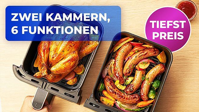 Wer nach einem langen Arbeitstag, nicht noch zwischen den Herdplatten hin und her springen möchte, dürfte sich über dieses Angebot freuen. Denn der Cosori Airfryer mit zwei Kammern* ist aktuell bei Amazon um satte 44 Prozent reduziert und damit beim alten Tiefstpreis gelandet – günstiger gab es ihn noch nie.