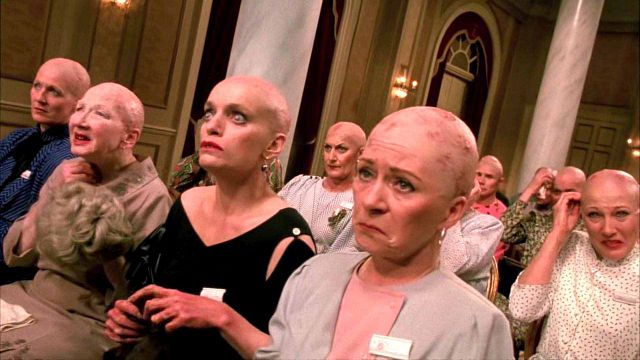 Die aufreizende Anjelica Huston transformiert sich im schaurigen Höhepunkt zur grotesk-entstellten Königin der Hexen. Sie legt ihre menschliche Hülle ab und offenbart ihr wahres Ich: Mit behaartem Kinn, runzeliger Haut, Glatze und einer grotesk gigantisch-spitzen Nase erinnert Oberhexe Miss Eva Ernst eher an einen grotesken Kobold, der bei lebendigem Leib verrottet – und in Anbetracht ihres Hexen-Alters ist diese Assoziation vielleicht auch gar nicht so weit hergeholt.