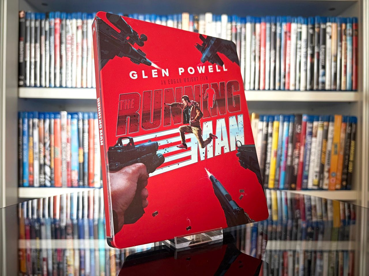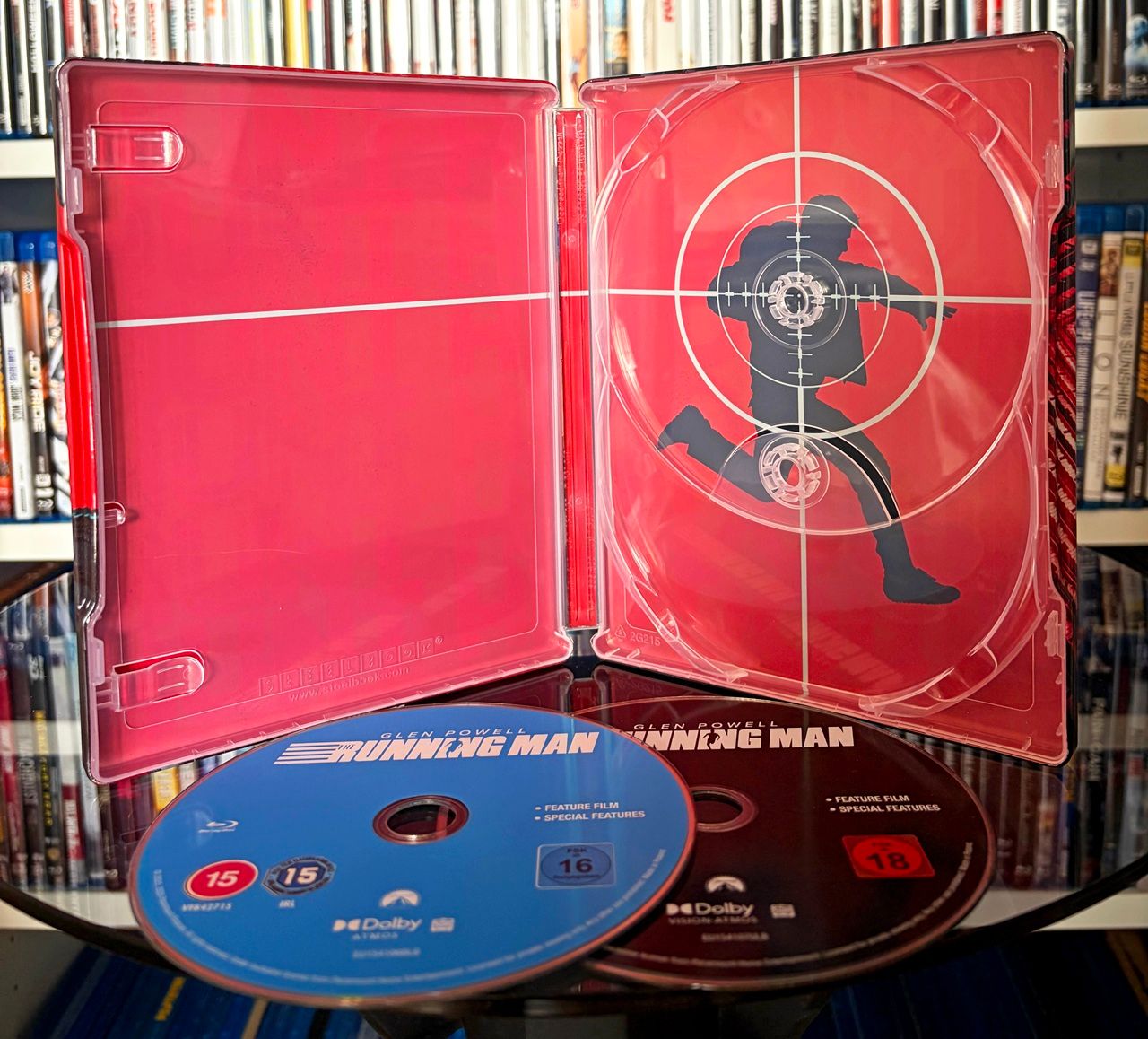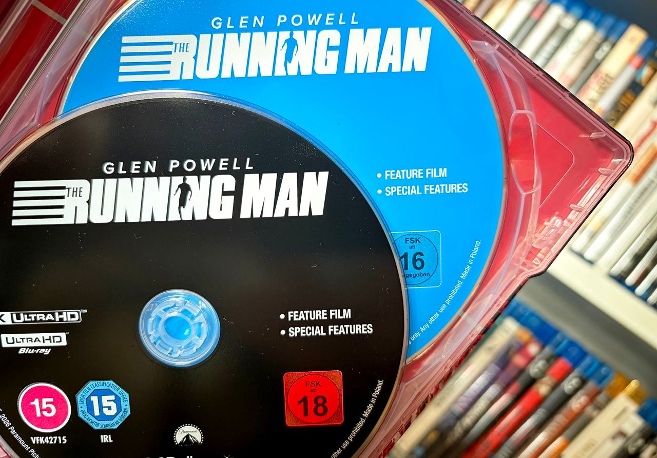 Die Rückseite zeigt ebenfalls den von „Twisters“- und „Top Gun: Maverick“-Star Glen Powell gespielten Ben Richards, der um sein Leben rennt – und damit das Tempo des Films hervorragend einfängt, der seinem Publikum zumindest bis zum Schlussakt kaum Zeit zum Durchatmen lässt.
