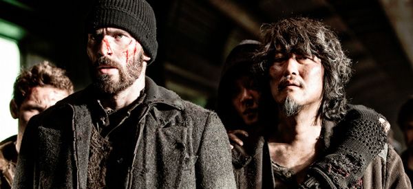 Zugpassagier Curtis (Chris Evans) erzählt dem koreanischen Sicherheitsspezialisten Namsoong von seiner dunklen Vergangenheit - in „Snowpiercer“.