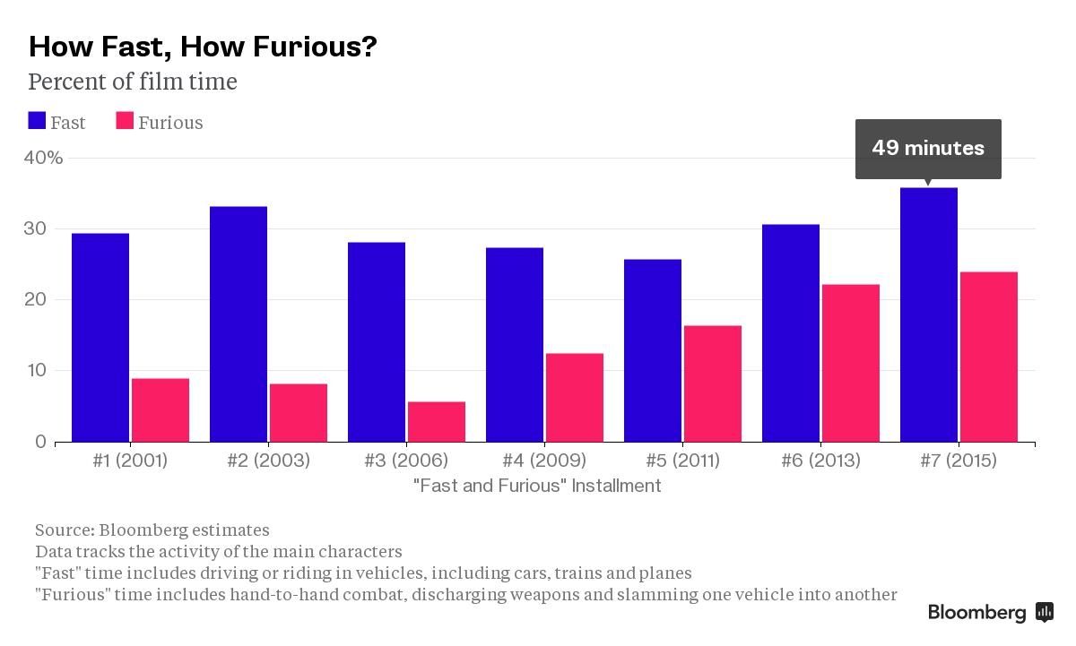 Hier seht ihr die Aufschlüsselung der Leinwandzeit von schnellen Fahrzeugen und Gewalt in den bisherigen sieben Filmen des Franchise und unter diesem Link erfahrt ihr bei Bloomberg noch mehr Statistisches über "Fast & Furious", zum Beispiel, in welchem der Filme am meisten geflucht wird…: