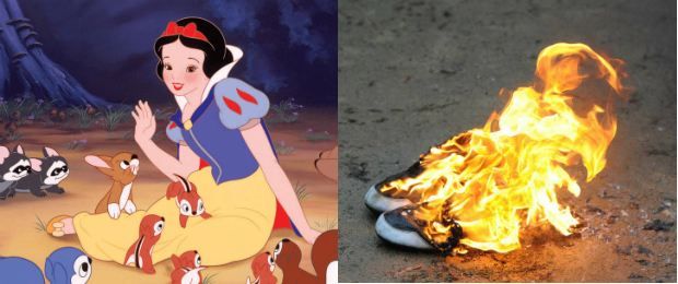 Und so grausam war's vorher: Um ganz sicher zu sein, dass Schneewittchen von dem Jäger getötet worden ist, verlangt sie als Beweis die Leber und das Herz des Mädchens, die sie außerdem verspeisen möchte. Der gutmütige Jäger servierte der eifersüchtigen Königin aber stattdessen die Organe eines Wildschweins. Am Ende ist es hier auch nicht der Kuss des Prinzen, der Schneewittchen wieder auferstehen lässt, stattdessen lässt der Prinz nur ihren gläsernen Sarg fallen, woraufhin Schneewittchen das in ihrem Hals steckende Apfelstückchen wieder herauswürgt. Die böse Stiefmutter bekommt am Ende auch noch ordentlich ihr Fett weg: Man zwingt sie, auf der Hochzeit von Schneewittchen und dem Prinzen in glühenden Schuhen zu tanzen, bis sie Tod umfällt.
