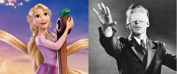 Und so grausam war's vorher: Als die Hexe von der Beziehung zwischen Rapunzel und einem Prinzen erfährt, schneidet sie ihrer Ziehtochter die Haare ab und verbannt sie in die Wildnis. Anschließend verkleidet sie sich als Rapunzel und verhöhnt den verliebten Prinzen so sehr, bis er aus dem Fenster des Turms springt, wobei er sich an den Dornen eines Busches so sehr verletzt, dass er fortan ziellos durch die Gegend wandert. (Im Gegensatz zu einigen anderen brutalen Märchen gibt es hier aber zumindest noch ein echtes Happy End: Der blinde Prinz hört zufällig den Gesang der verbannten Rapunzel und ihre Tränen heilen seine Augen.)