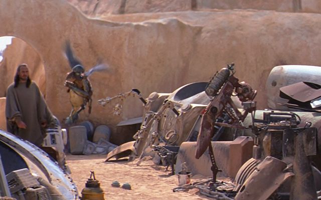 In „Eine dunkle Bedrohung“, wenn Qui-Gon Jinn auf Tatooine das Geschäft von Watto besucht (in der Mitte des Bildes direkt neben Watto).