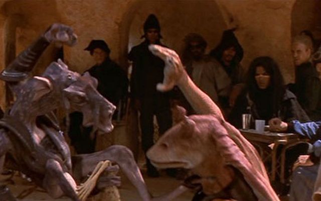 Wieder in „Eine dunkle Bedrohung“, wenn Sebulba Jar Jar Binks angreift (rechts im Bild).