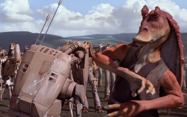 In „Eine dunkle Bedrohung“, am Ende der Schlacht zwischen den Gungans und den Droiden auf Naboo.