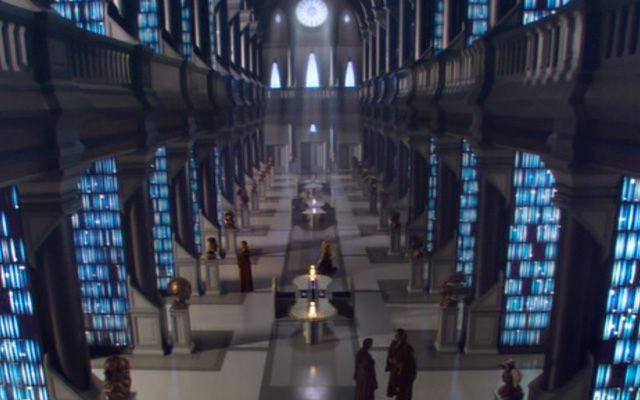 Es ist im Bild schwer zu sehen, aber die Büsten, die links und rechts des Hauptgangs aufgestellt sind, tragen die Gesichtszüge jener Jedi-Ritter, die dem Rat den Rücken gekehrt haben. Einige von ihnen haben dabei eine frappierende Ähnlichkeit mit bestimmten Mitgliedern der Produktion wie Spezialeffekt-Supervisor John Knoll oder Regisseur George Lucas.