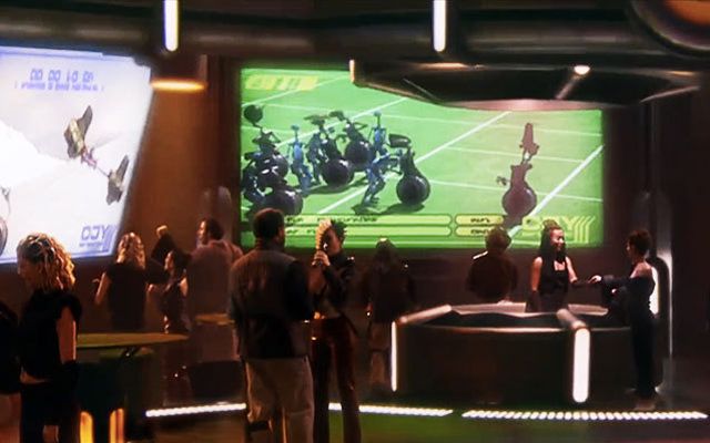 Auf zahlreichen Bildschirmen sind Sportereignisse und Spielshows aus der ganzen Galaxie zu sehen. Darunter auf dem linken Monitor auch ein Podrennen.