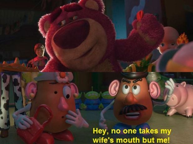 Als sich jemand am Mund von Mrs. Potato Head vergreift, schreitet Mr. Potato Head empört mit den Worten ein: „Niemand nimmt den Mund meiner Frau, außer mir.“ Klingt schon etwas versaut, meint ihr nicht?