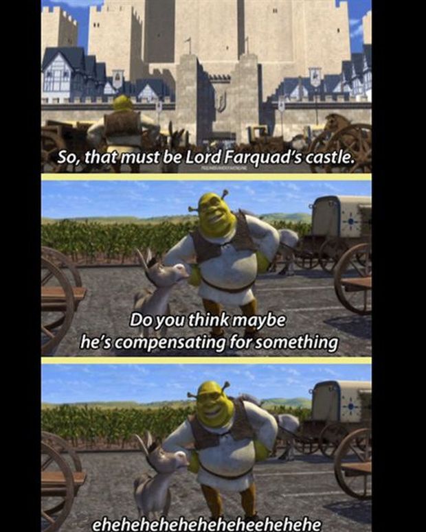 Der Animationshit um den tollpatschigen grünen Oger hat mehr als eine doppeldeutige Anspielung zu bieten. So merkt Shrek bei der Ankunft im Königreich von Lord Farquaad (was im Englischen schwer an die Bezeichnung „fuckwad“ für „Idiot“ erinnert) an, dass das Schloss aber ziemlich groß sei: „Meinst du, er kompensiert damit etwas?“, fragt der Oger seinen Gefährten uind bricht daraufhin in gehässiges Gelächter aus. Kinder dürften den Spruch auf die geringe Körpergröße des kleinen Lords beziehen. Erwachsene Zuschauer wissen aber natürlich, was wirklich damit gemeint ist…