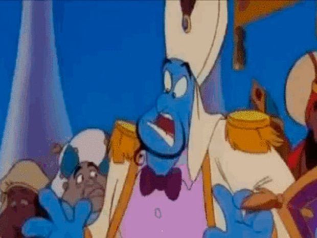 Als die 40 Elefanten den Pavillon zum Beben bringen, scherzt der Genie hinsichtlich der Hochzeit von Aladdin und Jasmine: „Ich dachte, die Erde würde erst in den Flitterwochen beben.“ Was der blaue Spaßvogel damit meint, bedarf wohl keiner weiteren Erklärung.
