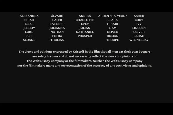 Auch die Macher von Disneys „Die Eiskönigin - Völlig unverfroren“ haben kein Problem damit, sich selbst und ihre Werke ein wenig aufs Korn zu nehmen. Am Ende des Abspanns können geduldige Gucker so zum Beispiel folgendes Statement lesen: „Die von Kristoff geäußerte Meinung, dass alle Menschen ihre eigenen Popel essen, ist gänzlich seine eigene und repräsentiert nicht die Ansichten der Walt Disney Company oder der Filmemacher.“ Ein gewitztes Spiel mit den Konventionen: Wenn andere Filmstudios schon vorsorglich Ähnlichkeiten mit realen Personen oder Ereignissen ausschließen oder sich von im Film vertretenen Meinungen distanzieren, warum dann nicht auch von denen einer Animationsfigur?