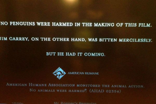 Mark Waters' Klamauk-Komödie „Mr. Poppers Pinguine“ ist vielleicht nicht das Gelbe vom Ei (--> zur 2,5-Sterne-Kritik), aber zumindest die Abwandlung eines üblichen Abspannsatzes ist den Machern gut gelungen: Wie immer werden die Zuschauer darüber informiert, dass kein Tier beim Dreh des Films zu Schaden kam. Anschließend folgt hier aber noch der humorvolle Twist: „Jim Carrey jedoch wurde erbarmungslos von ihnen gebissen. Aber er hat es verdient.“ Und das, obwohl Jim Carrey ja einst als Tierversteher Ace Ventura einen weltweiten Kinohit landete!