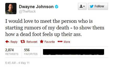 Bereits zweimal verbreitete sich die Meldung in den sozialen Netzwerken, dass Dwayne Johnson bei Dreharbeiten in Neuseeland von einer Klippe gestürzt und dabei umgekommen sei. Im Mai 2011 reagierte der ehemalige Wrestler noch direkt auf die Nachricht und wollte den Verantwortlichen gerne zeigen, wie sich so ein angeblich toter Fuß anfühlt, wenn er einem in den Hintern tritt: