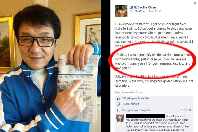 Auch Jackie Chans Name wurde verwendet, um bei Facebook unvorsichtige User auf betrügerische Seiten umzuleiten. Die Meldungen besagten, dass er bei einem Stunt zu seinem neuen Film ums Leben gekommen sei – schließlich ist Chan bekannt dafür, die oft lebensgefährlichen Stunts in seinen Filmen immer selbst zu absolvieren. Anders als Charlie Sheen reagierte er jedoch direkt darauf und postete ein Foto von sich, auf dem er eine Zeitung mit dem aktuellen Datum hochhält, und versicherte seinen Fans, dass alles in Ordnung sei: