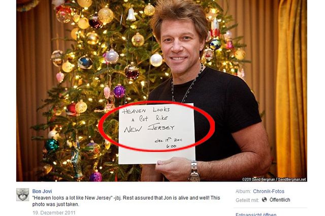 Im Jahr 2011 zirkulierten gleich mehrere Falschmeldungen über den Tod von Jon Bon Jovi, der angeblich einen Herzstillstand erlitten hatte. Als er schließlich auch noch auf seiner Wikipedia-Seite für tot erklärt wurde, veröffentlichte der Musiker und Schauspieler („U-571“) auf Facebook ein Foto, auf dem er ein Schild mit der Aufschrift „Heaven Looks A Lot Like New Jersey“ („Der Himmel sieht ganz schön wie New Jersey aus“) und dem aktuellen Datum hochhält: