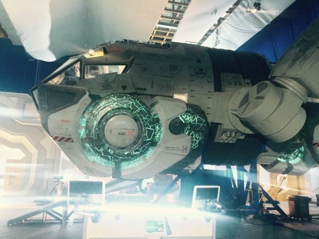 In den Studios angekommen, geht es direkt in eine riesige, für einen Blue-Screen-Dreh ausgekleidete Halle. Dort ist schon die Bühne für die Pressekonferenz aufgebaut, aber viel interessanter ist, was wir dahinter erspähen – denn das gibt uns erste Hinweise auf den Look des Alien-Blockbusters: Neben einer Mondbasis stehen ein tonnenschwerer Human Hybrid Fighter Jet und ein nicht weniger mächtiger Moon Tug, den – wie wir später erfahren – Liam Hemsworths Charakter im Film fortbewegen wird.