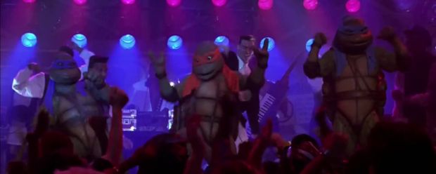 Mit dem unsäglichen „Turtles III“ wollen wir gar nicht erst anfangen, aber verwunderlicherweise genießt auch dessen Vorgänger zumindest ein gewisses Kult-Ansehen, welches er wirklich nicht verdient hat. Und das führen wir jetzt nicht nur auf den mega-peinlichen „Ninja-Rap“-Auftritt von Vanilla Ice zurück. Nein, auch inhaltlich wie visuell hat das fortschreitende Alter der Comicverfilmung alles andere als gut getan. Abgesehen von der zum Himmel schreiend dämlichen Handlung und der Einführung lachhafter Figuren wie Super Shredder (gespielt von US-Wrestler Kevin Nash) ist auch die gezielte „Auflockerung“ der vormals düsteren Atmosphäre ein kompletter Schuss in den Ofen: Die grellen, bunten Farben haben nichts mit dem Look der ursprünglichen Turtles-Comics von Kevin Eastman und Peter Laird gemein und davon abgesehen betonen sie unnötig die Künstlichkeit der (zugegeben technisch aufwendig umgesetzten) Schildkröten-Puppen aus dem Hause Jim Henson’s Creature Shop. Da tut es einem fast schon leid, dass der 1990 verstorbene Puppenspieler und Künstler, der vor allem durch die „Sesamstraße“ und die „Muppet Show“ weltweite Bekanntheit erlangte, in diesem albernen Trash-Quark gleich zu Beginn eine Widmung erhielt.