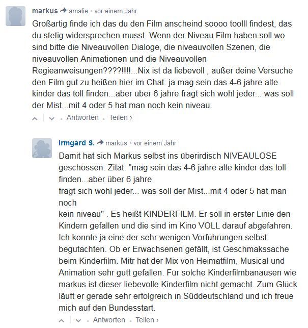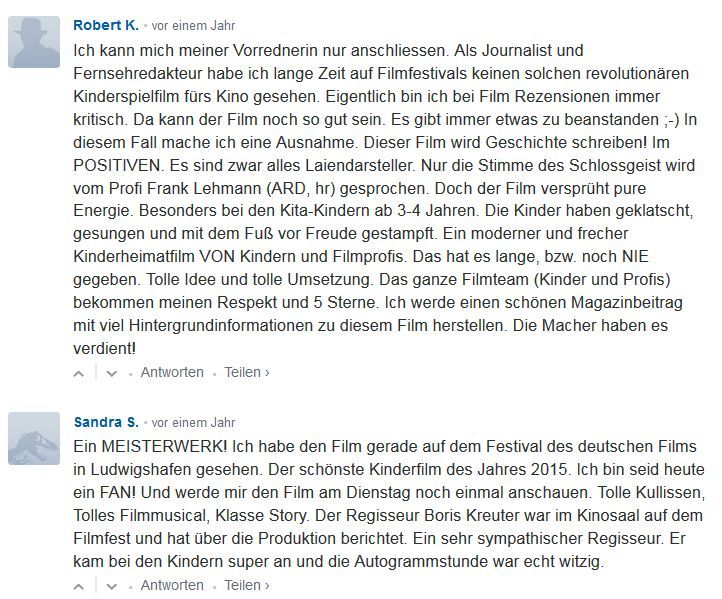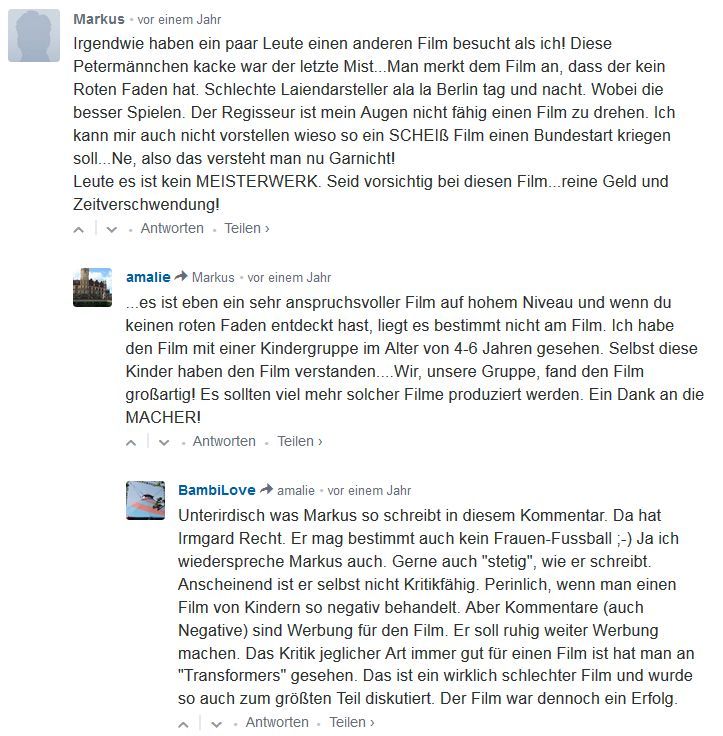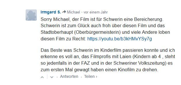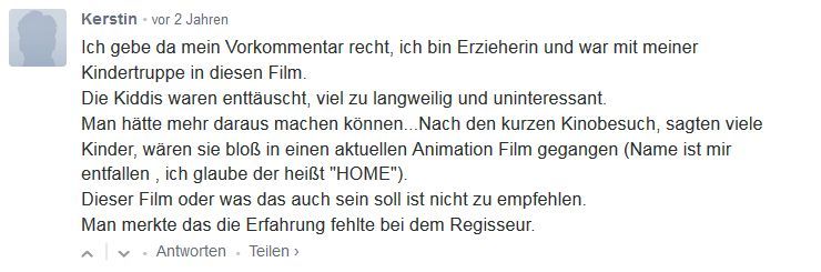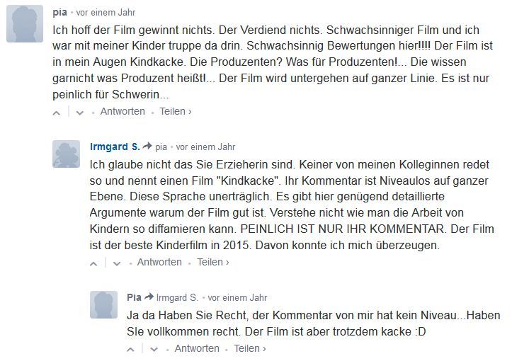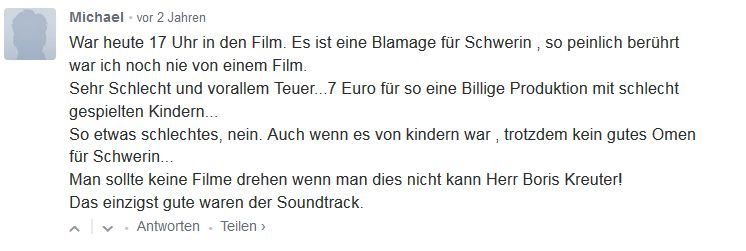 Nachdem der Film im April 2015 in Schwerin Vorpremiere feierte (und danach für zwei Wochen in einem Kino der Stadt täglich als Testvorführung gezeigt wurde), trudelten auf FILMSTARTS erst einmal diese beiden Kommentare ein: