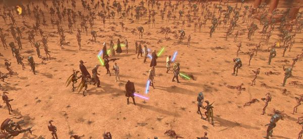 Die Schlacht auf dem staubigen, rot-braunen Planeten Geonosis leitet nicht nur das Finale von „Star Wars: Episode II - Angriff der Klonkrieger” sondern auch die drei Jahre währenden Klonkriege ein. Nur knapp können Obi-Wan Kenobi (Ewan McGregor), Anakin Skywalker (Hayden Christensen) und Padmé Amidala (Natalie Portman) ihrem Tod in einer Arena auf Geonosis entkommen, als sie von einer Droidenarmee angegriffen werden. Doch das Glück ist auf ihrer Seite: Nur wenige Zeit später werden sie von Klonkriegern unter der Führung von Meister Yoda sowie einer Horde Jedi-Ritter gerettet, die ihre Überlegenheit eindrucksvoll unter Beweis stellen und das Startsignal für einen gewaltigen Kampf auf dem gesamten Planeten geben.