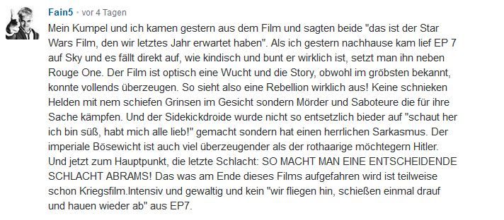 Während Fain5 darauf hofft, dass der neue realistisch-ernste Kurs in „Star Wars: Episode VIII“ beibehalten wird und J.J. Abrams‘ „Das Erwachen der Macht“ als „kindisch und bunt“ abtut, vermisst FILMSTARTS-Chefredakteur Carsten Baumgardt in seiner Besprechung von „Rogue One“ „dieses ganz spezielle ‚Star Wars‘-Feeling“ sowie „das große emotionale Herz des Vorgängers ‚Das Erwachen der Macht‘“– zwei Aspekte, die angesichts des „schmutzigen Looks und der martialischen Action“ sowie der „ungewohnten Kriegsästhetik“ des Ablegers weitestgehend verloren gegangen wären.