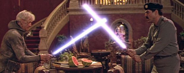 Nachdem Lloyd Bridges als wenig zurechnungsfähiger Admiral Tug Benson seine „Top Gun“-trifft-Hirnschlag-Fliegertruppe um Topper Harley (Charlie Sheen) und „Fischauge“ Pfaffenbach (Jon Cryer) in der Operation „Schläfriges Wiesel“ zum Sieg geführt hatte, konnte in der „Hot Shots“-Fortsetzung „Der zweite Versuch“ nur eine weitere logische Karriereoption für ihn folgen: Präsident der Vereinigten Staaten von Amerika! Und natürlich glänzt der hochdekorierte Kriegsheld und Staatsmann, bei dem sich vielleicht der ein oder andere Granatsplitter zu viel durch die Gehirnwindungen gewühlt hat, auch in dieser Position und schafft etwas, das die Amerikaner in der Realität erst zehn Jahre nach der Premiere des 1993er-Klamauk-Klassikers bewerkstelligten: Er stößt Saddam Hussein von seinem staubigen Wüstenthron. Doch sitzt Tug dabei nicht wie George W. Bush im wohltemperierten Kommandoraum in Weißen Haus, sondern stellt sich in einem hitzigen Laserschwert-Kampf höchstpersönlich dem bärtigen Diktator – und besiegt ihn nach alter Navy-Tradition: Wer als erster stirbt, verliert.