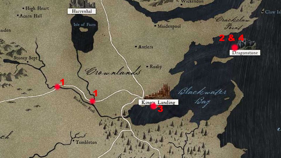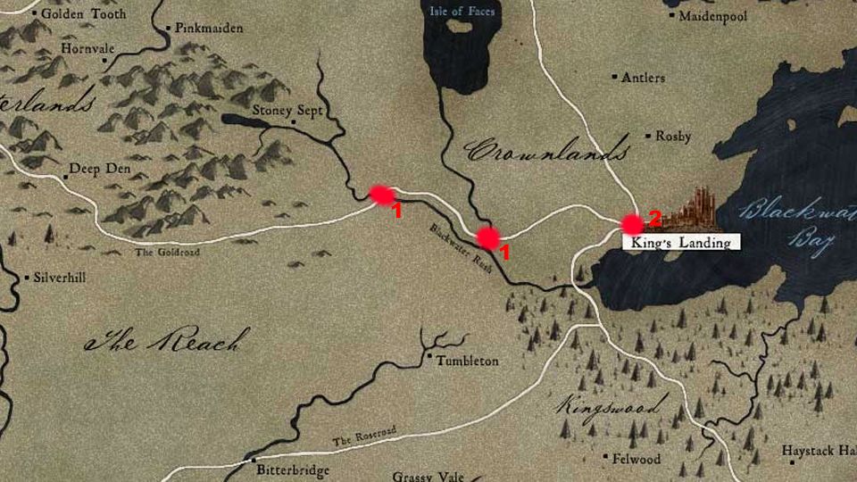 Zu Beginn der aktuellen Folge kriecht Jaime (Nikolaj Coster-Waldau) gemeinsam mit Bronn (Jerome Flynn) ans Ufer des Blackwater Rush (= Schwarzwasser). Das nächste Mal, als man den geschlagenen Lannister-Heerführer sieht, marschiert er zielstrebig auf die Schlafzimmertür seiner Schwester Cersei (Lena Headey) zu. Allzu lange braucht man für diese Strecke wohl nicht - unabhänig davon ob Jaime und Bronn ein Pferd oder eine sonstige Transportmöglichkeit aufgetrieben haben: Der Lannister-Zug wurde auf der sogenannten Goldroad, die von Casterly Rock (= Casterlystein) nach King’s Landing (= Königsmund) führt, angegriffen. Jaime wurde gerettet, in dem er in den Blackwater gestoßen wurde. Dieser und die Straße kreuzen sich jedoch nur zweimal kurz vor der Hauptstadt, was wir auf der folgenden Karte mit einer 1 markiert haben. An einem dieser Orte muss der Kampf stattgefunden haben. Da Jaime danach flussabwärts sogar noch näher an die Hauptstadt (Punkt 2 auf der Karte) getrieben ist, dürfen es gerade mal 150 bis maximal 300 Kilometer dahin gewesen sein.