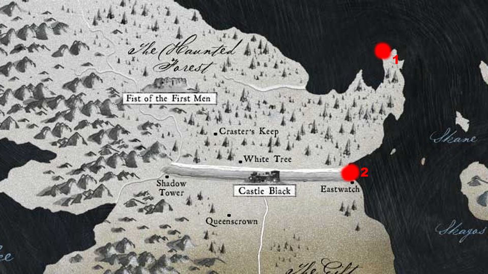 Jon (Kit Harrington) bricht zwar „nur“ von Dragonstone nach Eastwatch-By-The-Sea (= Ostwacht) auf, doch allein diese Reise, die man komplett per Schiff zurücklegen kann, ist deutlich länger als Tyrions Abenteuer: Über 4.000 Kilometer sind es von Dragonstone (1) über das Meer zum östlichsten Punkt der Mauer (2). Wenn man auch hier, wie schon bei Tyrion, eine Durchschnittsgeschwindigkeit von fünf Knoten zugrunde legt und davon ausgeht, dass Jon, Jorah (Ian Glen), Gendry (Joe Dempsie) und Co. ohne Unterbrechung gen Norden segeln, wären sie schon rund 17 Tage unterwegs. Eine lange Zeit, wenn man bedenkt, dass eine gigantische Untoten-Armee anrückt.