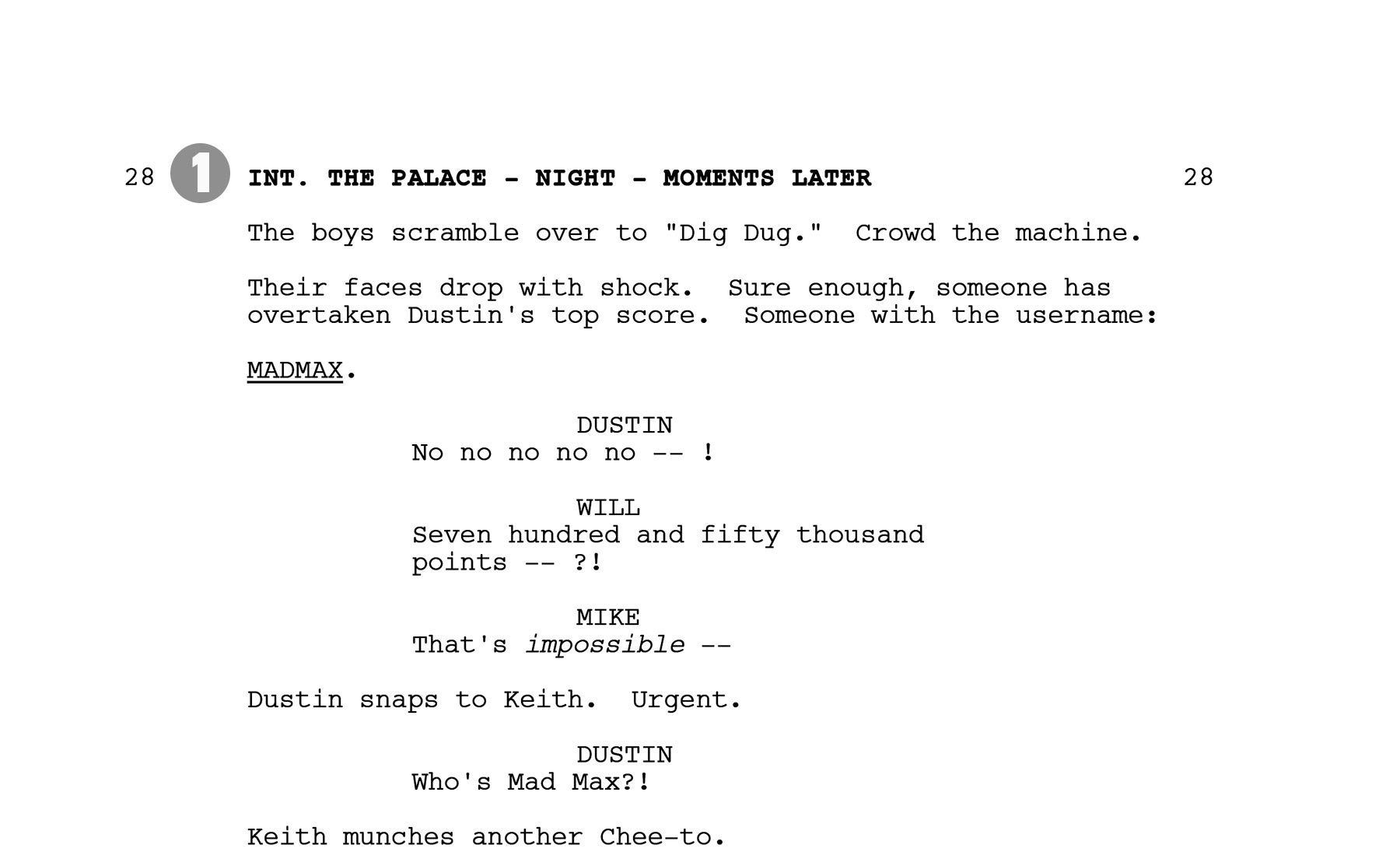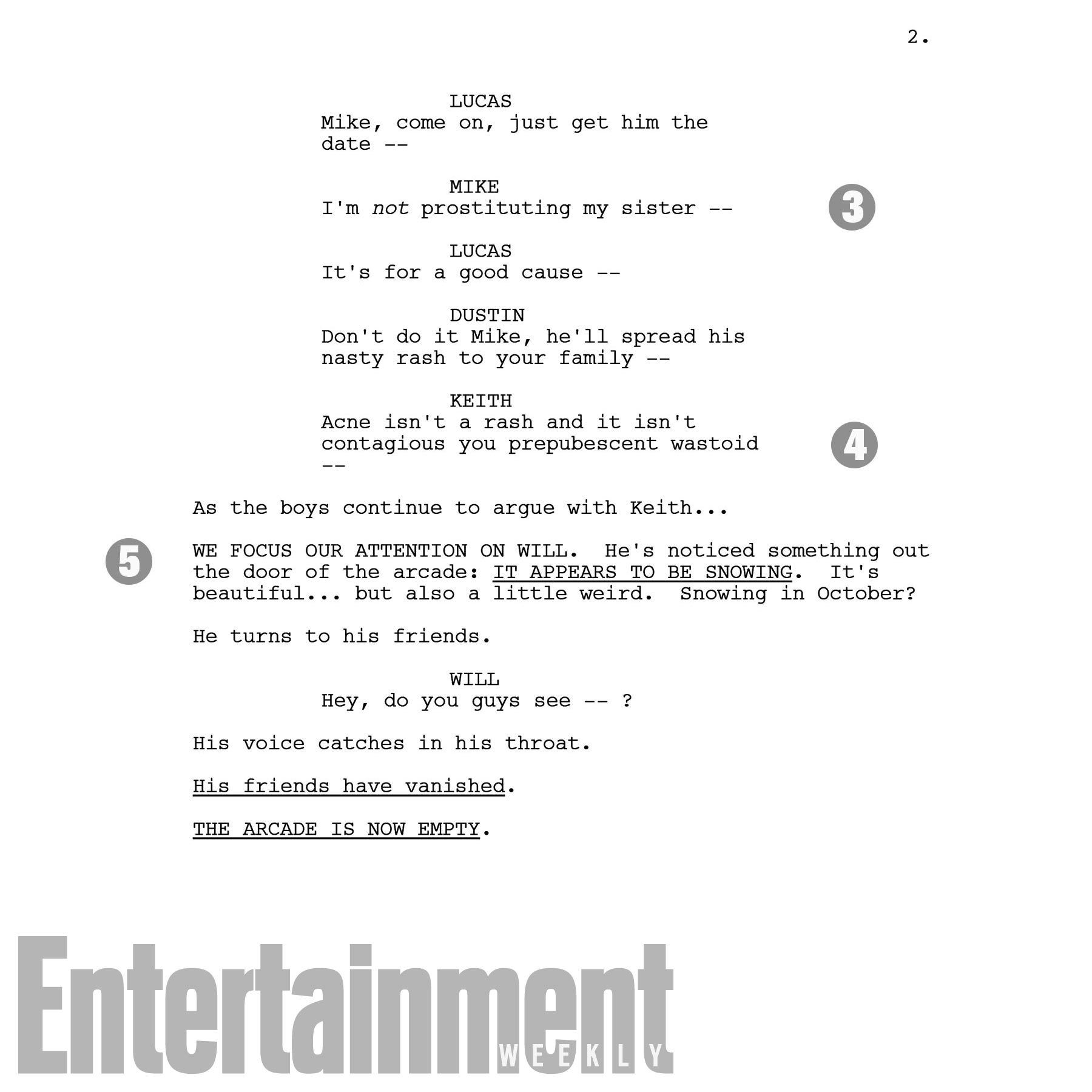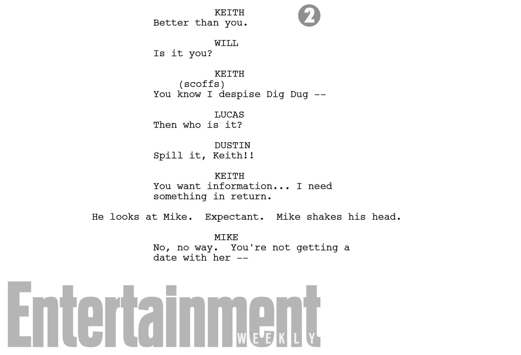 Die Duffer-Brüder merken zu den Drehbuchseiten an, dass die Einführung einer Arcade-Halle als Schauplatz ihre erste Idee für Staffel zwei war. Als Kinder hätten sie, zumindest laut ihrer Mutter, selbst viel zu viele Videospiele gespielt. „Jeder Automat hat funktioniert, in den Pausen haben wir also gezockt“, verraten die Serienschöpfer. Die neue Figur namens Keith, gespielt von Matty Cardarople, beschreiben die beiden folgendermaßen: „Er arbeitet in der Arcade-Halle The Palace. Er ist älter als die Jungs, aber trotzdem unreifer. Und das einzige, das er mehr mag als Cheetos, ist Nancy.“ Zudem erwähnen die Duffers, welche Hommage an Kult-Regisseur John Hughes sie eingebaut haben: „Das Slangwort wastoid (steht für eine wenig geschätzte Person, einen Verlierer oder Loser) wurde 1985 durch den ‚Breakfast Club‘ populär. Der Film erschien zwar eigentlich erst rund vier Monate, nachdem die Handlung der zweiten Staffel endet, aber wir konnten nicht anders, als die Geschichte hier ein bisschen zu beugen und in dieser Form unseren Hut vor John Hughes zu ziehen.“