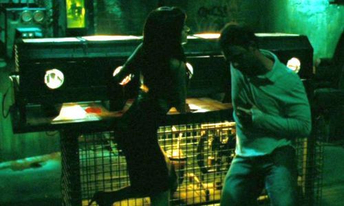 Die Falle: Weil sie fälschlicherweise annahmen, dass bei jeder Falle einer von ihnen sterben muss, haben es von den fünf Jigsaw-Opfern zu Beginn des Parcours nur zwei bis in den letzten Raum geschafft. Hier müssen sie einen Behälter bis zu einer bestimmten Marke mit ihrem Blut füllen, um nicht von einer Bombe in die Luft gejagt zu werden. Hätten es alle bis hierher geschafft, hätte jeder nur ein wenig Blut spenden müssen, aber so müssen Mallick und Brit mit den surrenden Kreissägen schon ziemlich tief in ihre Unterarme hineinsägen, um die nötige Menge zusammenzubekommen. Trotzdem überleben beide - Respekt!