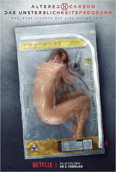 In „Altered Carbon - Das Unsterblichkeitsprogramm“ ist es in einer 300 Jahre entfernten Zukunft möglich, nach dem Tod das eigene Bewusstsein in einen neuen Körper zu transferieren und so potenziell ewig zu leben. Die Ersatzkörper werden - wie das Modell in der umstrittenen Straßen-Werbung - in einem Plastikbeutel bereitgehalten, um von einem neuen Bewusstsein besetzt zu werden.