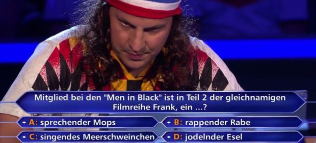 Schon einer der vorangegangenen Kandidaten wurde an diesem Montagabend mit einer Filmfrage konfrontiert - allerdings schon bei 8.000 Euro (siehe Bild über diesem Absatz): Um was für ein Tier handelt es sich bei der Figur Frank aus „Men In Black 2“ aus dem Jahr 2002? Timo Ehlert, der nach eigener Aussage „das letzte Mal bei „Go Trabi Go“ im Kino“ war, zog das Publikum zurate - und die Zuschauer im Studio konnten dem Sozialpädagogen mit einem überwältigend-eindeutigen Ergebnis von 91 Prozent tatsächlich aus der Patsche helfen: Ehlert loggte die korrekte Antwort „sprechender Mops“ ein und räumte am Ende immerhin 16.000 Euro ab.