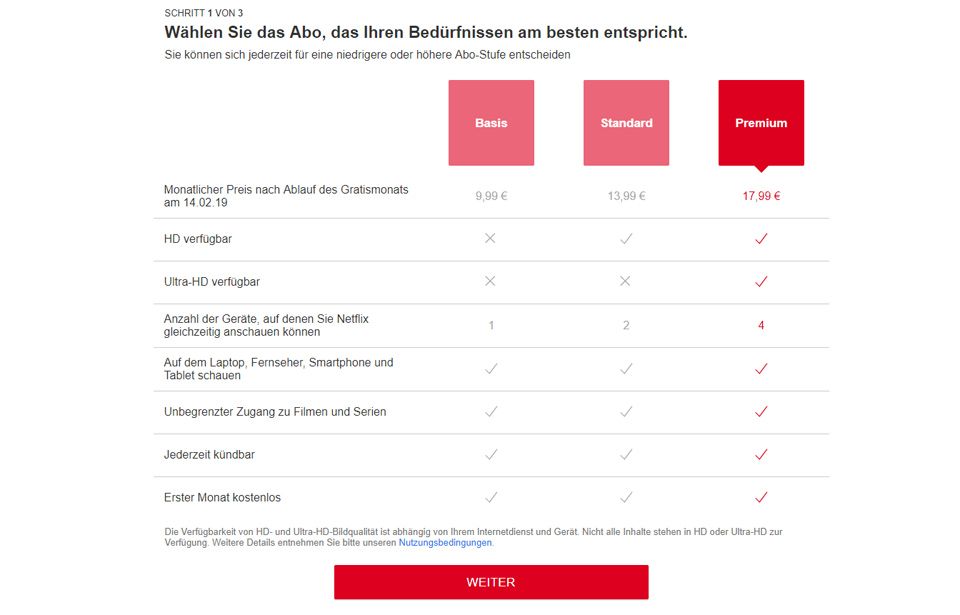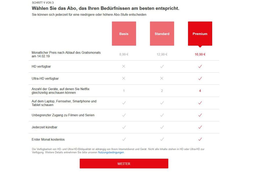 Bei einem anderen Anmeldeversuch waren die Preise sogar noch höher. Hier lagen wir je nach Modell, zwei bzw. drei oder sogar vier Euro über dem aktuellen Preis. Ein Premium-Abo kostet hier 17,99 Euro statt bisher 13,99 Euro: