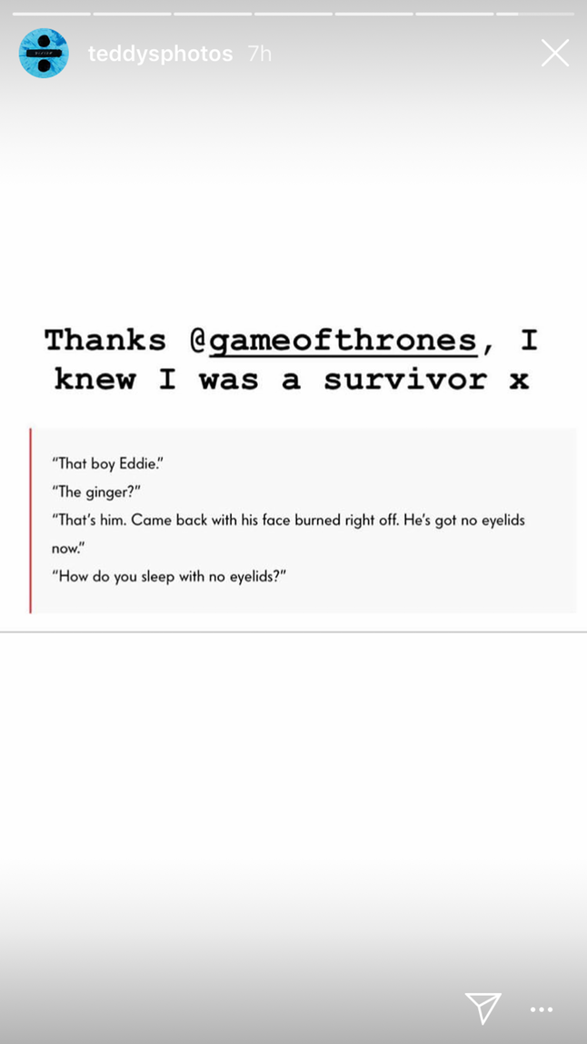 Und mit seiner Reaktion in einer Instagram-Story hat Ed Sheeran selbst so gut wie bestätigt, dass es seine Figur ist, der dieses fiese Schicksal widerfahren ist. Wobei er sich aber vor allem darüber freut, dass er mit der Vermutung, seine Figur lebe noch, recht behalten hat: „Danke @gameofthrones, Ich wusste, ich bin ein Überlebender.“ (Screenshot via Bustle)